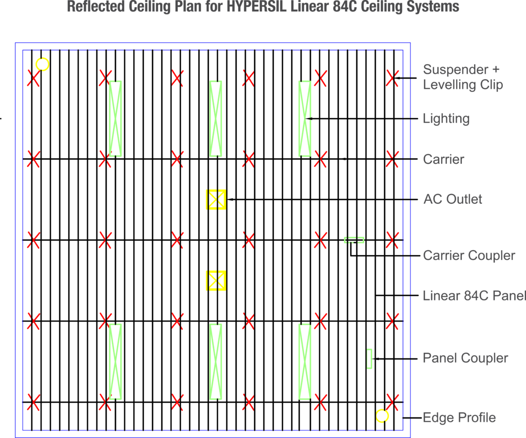 HYPERSIL® Linear 84 C closed ceiling system consisting of 84mm / 184mmwide square shaped panels which can be easily clipped on to a carrier. The Panels have a 25 mm wide flange that closes-off the 16 mm joint between the panels. A wide choice of colours and finishes are available. Panels can be perforated for enhanced acoustics.