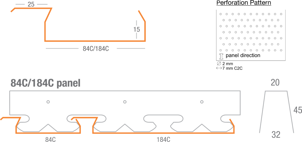 Panels: Square edge, 84mm / 184mm wide, 15mm deep, length up to 3 mtr. with 25mm flange.
